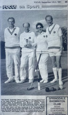 Hawkenbury: 1993 finalists: Final played at Loves Farmhouse (by kind permission of Gordon Drake). Back row: John Timmis, Peter Howell , Barney Lewis, Mick Belcham. Front row: Derek Hinchcliffe, Miriam Reader, Jill Carpenter, Singles winner: Barney Lewis, Doubles: Derek Hinchcliffe and John Timmis, High Bisquers: Miriam Reader